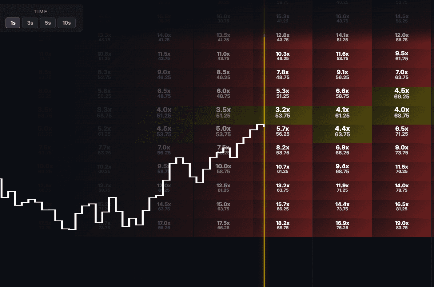 A vertical price grid displays real-time crypto movements. Tap a grid zone to predict short-term price direction. Instant execution, immediate feedback.
